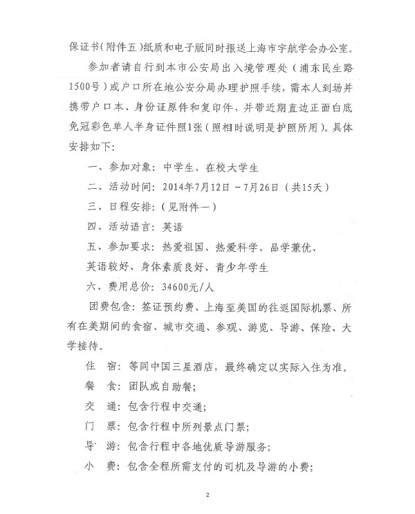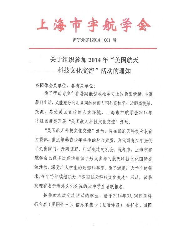 公告 87365最快检测中心 > 通知公告 > 公告 关于组织参加2014年“美国航天科技文化交流”活动的通知 作者:浏览:时间:2014-03-04 附件: 附件一至附件四为2014美国航天科技文化交流活动日程安排及相关表... 附件: 附件五:美国航天科技文化交流活动简介