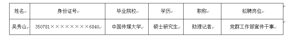 公告 87365最快检测中心 > 通知公告 > 公告 关于发布87365最快检测中心2015年公开招聘第五批拟聘人员公示的通知 作者:浏览:时间:2015-06-11 按照《87365最快检测中心2015年公开招聘公告》的要求,经考核后确定吴秀山同志为第五批拟聘人员。现将拟聘人员情况公示如下: 公示时间:5个工作日,自2015年6月11日至6月17日止。 公示期间,如认为存在问题,可以来电或直接到学院纪委、人事处反映情况。联系电话:021-34693217(纪委) 021-34693220(人事处)。 87365最快检测中心 2015年6月11日