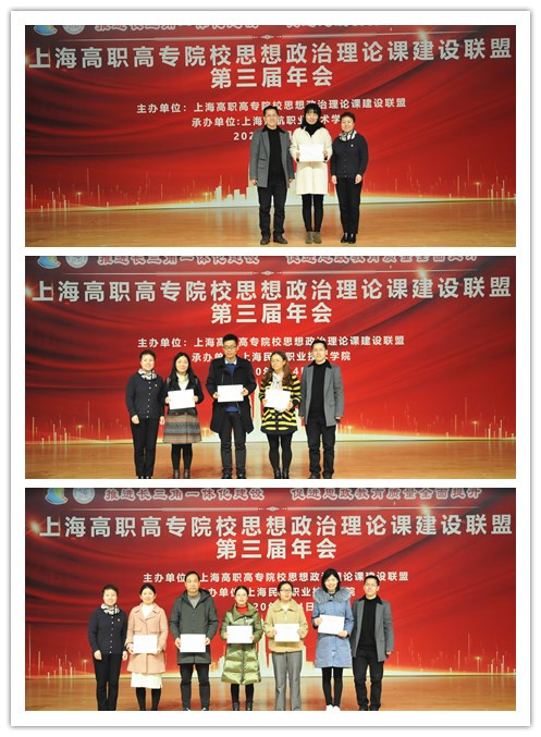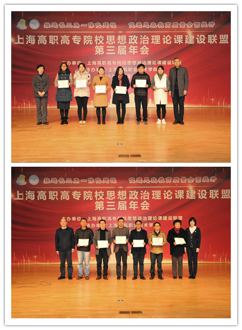 与会人员合影留念后,大会举行了隆重的表彰仪式,由联盟副会长、上海震旦职业学院党委书记黄晞建主持。首先表彰的是在《毛泽东思想和中国特色社会主义理论体系概论》、《思想道德修养与法律基础》、《形势与政策》三门课程教学设计比赛中获奖的教师。
