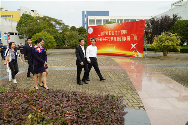 开学典礼结束后,资深飞行员、原民航总局局长杨元元主讲开学第一课,学院党委班子成员、中层干部、教师代表与新生们共同聆听。中国商用飞机有限责任公司董事长兼党委书记贺东风、中国民用航空华东地区管理局副局长吕新明、中国东方航空集团公司党组副书记唐兵、华东空管局党委书记朱士新、上海机场集团有限公司党委副书记张永东和国航上海分公司、南航上海分公司、厦航上海分公司、上海普惠飞机发动机维修有限公司、上海航空、春秋航空、吉祥航空、中航油华东公司、虹桥国际机场公司、上海国际机场股份有限公司、上海外航服务公司等相关单位领导出席活动。与学院共同培养中高贯通人才的7所中职学校、上海社科院和上海东方明珠新媒体股份有限公司等学院合作单位领导也受邀出席。