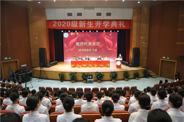 开学典礼由杨征副院长主持。庄重的出旗仪式后,航空制造系王诚老师率先登台作为教师代表发言。他表示,校园因2020级新生的到来而更加美丽欢腾,希望同学们做一个有道德、会学习、够坚强的人,通过三年的大学生活成长为合格的准民航人,师生携手为建设民航强国努力奋斗。