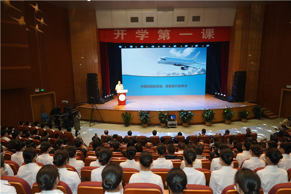 他强调,民航作为国家经济基础性、先导性产业,是一个系统性、专业性、技术性、国际性的行业,民航的发展水平和状况象征着一个国家发展的现代化程度,需要一大批高素质、懂业务、技术精、勇于创新的人才。他指出,民航业在快速发展的同时也面临巨大的挑战,这也正是同学们施展才华的舞台。今年是全面建成小康社会的收官之年。党的十九大报告提出,到2035年要基本实现现代化,在此基础上再奋斗十五年,到2050要把我国建设成为富强民主文明和谐美丽的现代化强国。同学们风华正茂恰逢其时,这些目标的实现就落在我们青年一代身上。希望同学们学以修身,习以养德,在校期间打好基础,努力做到“智者无虑,仁者无忧,勇者无惧”,通过三年的大学生活学有所成、报效国家、成就自己!