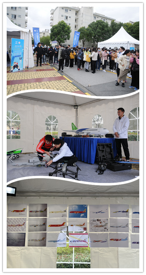 大飞机讲坛圆满结束,校园路演紧接着火热登场。活动现场滚动播放商飞宣传片并现场接收简历,同学们不仅可以参加有趣的航空知识有奖竞答活动,还能通过VR展示体验国产大飞机,观看模型社的静态展示和航模社的动态展示,现场为“我眼中的大飞机”校园喷绘大赛作品投上一票。伴随着发动机的轰鸣,航模社同学自己动手制作的C919模型飞机飞上云天,也把同学们的激情载入云天。