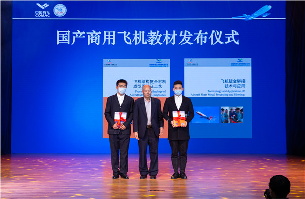 大国工匠王伟代表中国商飞向学院赠送教学资料,航空制造系主任陆周介绍了校企双方共同编写的两本国产商用飞机教材的基本情况,并向学生代表现场赠书。