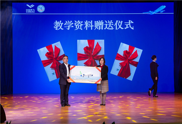 开幕式上放映了商飞宣传片,ARJ 21首飞纪实和C919首飞纪实的珍贵视频激发了学院师生学以致用、翱翔蓝天的志向。随后,中国商飞公司人力资源部沈大立部长代表商飞向学院赠送C919飞机模型,章恒龙副院长代表学院接受赠送。