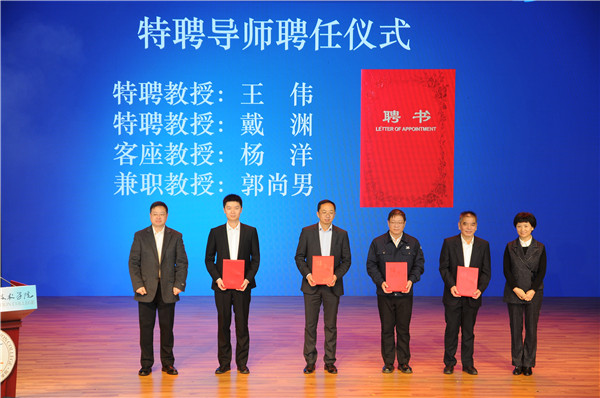学院聘请上海飞机制造有限公司的王伟、戴渊、杨洋、郭尚男等四名经验丰富、技术卓越的大国工匠、高级工程师、高级技师为学院的特聘教授,学院副院长孙暄、纪委书记姚力军向他们颁发了聘书。