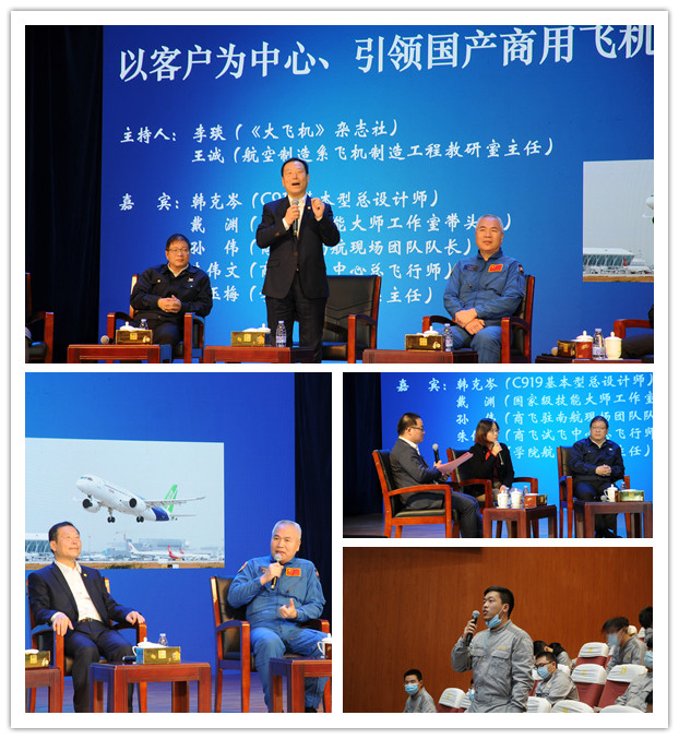 大飞机讲坛是此次国产商用飞机校园巡展的一出重头戏,特别邀请了C919基本型总设计师韩克岑、中国商飞试飞中心总飞行师朱伟文、国家级技能大师工作室带头人戴渊、中国商飞驻南航现场团队队长孙伟和学院航空维修系主任罗玉梅担任访谈嘉宾,《大飞机》杂志社李琰和学院航空制造系王诚老师主持活动。