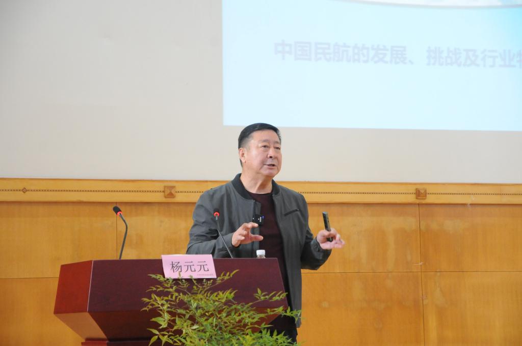 看着英姿勃勃的民航新鲜血液,杨元元动情地从自己当年在空军预备学校参加军训的故事讲起,通过中国航空先驱冯如的故事、周恩来总理对民航工作“保证安全第一,改善服务工作,争取飞行正常”的批示和民航规章制度的逐步建立,对中国民航的发展历程娓娓道来。杨元元还讲解了旅客运输、航空货运发展的广阔前景和存在的问题,通用航空发展对理念、安全、人才需求和航空文化的挑战和机场建设管理等技术问题。他指出,民航是一个系统性、专业性、技术性、国际性的行业,需要一大批拥有爱国情怀的高素质、懂业务、技术精、有国际视野、勇于创新的人才。中国民航在快速发展的同时也面临巨大的挑战,这也正是同学们施展才华的舞台,希望同学们既要有远大的理想目标,又要坚持不懈、脚踏实地、珍惜时间,在国家和民航改革开放的大局中谋划未来,成就国家,成就行业,成就自己!