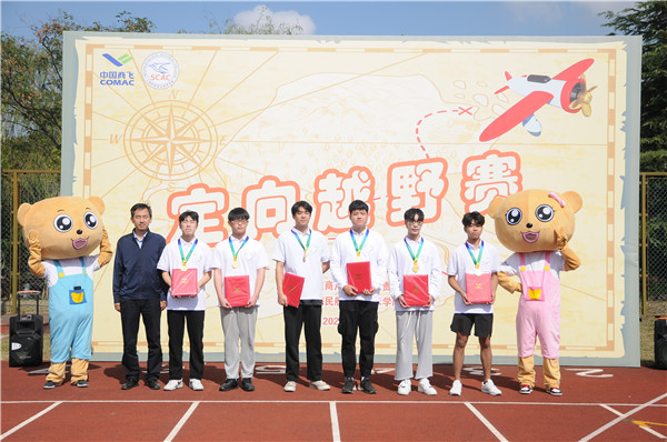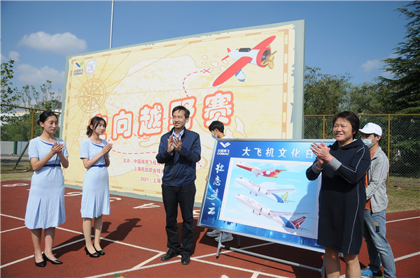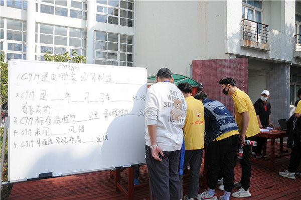 启动仪式过后,“大飞机文化日”活动正式开幕。伴随着航空制造系党支部书记李冰雪老师的一声枪响,身着红衣的5队选手率先开跑,拉开了此次“锻造民族魂,共筑强国梦”校园定向越野赛的序幕。定向越野赛包括视频记忆、是与不是保驾护航、打卡拍照等答题打卡环节,以国产商用飞机研制发展过程和飞行运行情况为答题主线,生动活泼地宣传大飞机文化。终点拼图处,15支参赛队伍依次将比赛中获得的拼图嵌入图板,ARJ21、C919、CR929的机身渐渐显现。学院教务处处长潘云和商飞人力资源部刘欣处长共同完成了大飞机的最后两块拼图。