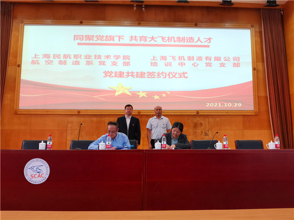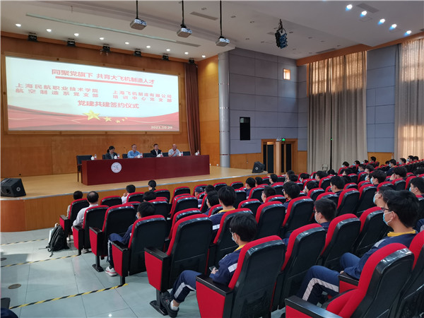 尚智堂内,学院航空制造系副主任、党支部李冰雪与上飞公司培训中心主任、党支部书记丁建岗老师共同签署党支部共建协议,“同聚党旗下、共育大飞机制造人才”,发挥各自优势,将上飞文化与学院日常教学零距离对接,共同培养企业用得上、留得住、用得好的学生。