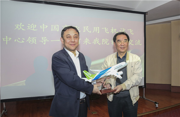 座谈会结束时,李彤代表试飞中心向学院赠送了一架C919飞机模型,希望双方未来能够进一步加强交流与合作。胡亚明代表学院接受赠送,并表示感谢。