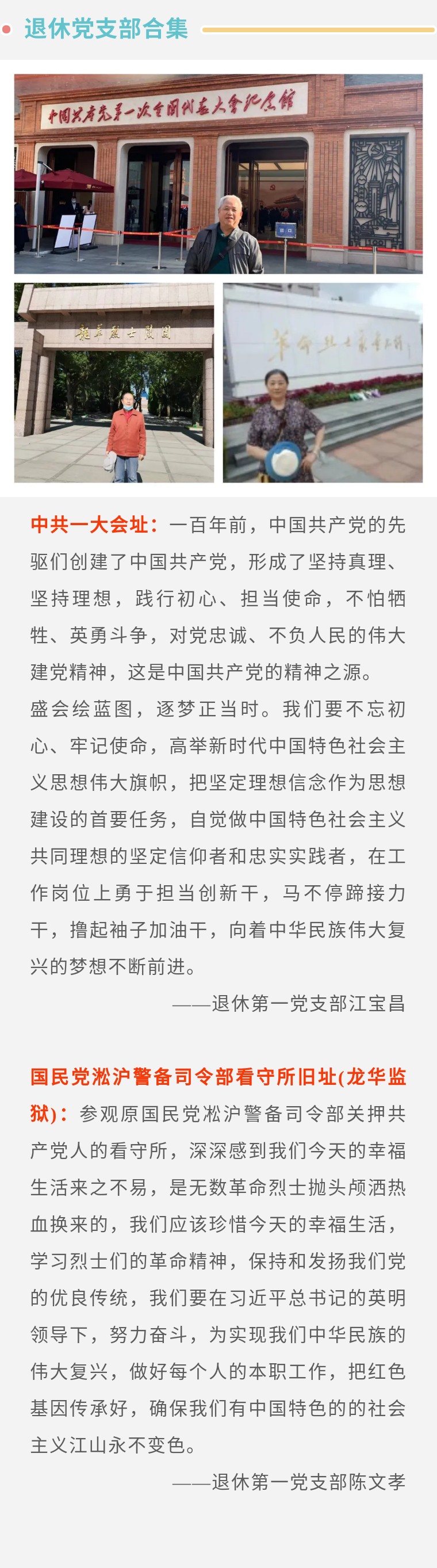 36365线路检测中心 87365最快检测中心 > 36365线路检测中心 > 36365线路检测中心 学院顺利开展“寻访红色史迹、赓续初心使命” 主题实践活动 作者:浏览:时间:2021-12-24 为充分利用上海的红色资源,积极引导广大教职员工铭记革命先辈的奋斗牺牲和崇高风范,深化党史学习教育成效,人事处联合党委办公室于2021年9月在全院范围内启动了“寻访红色史迹、赓续初心使命”主题实践活动。活动期间,共收到个人和团队照98张,微感言若干。现将部分照片和微感言公开展示,让我们跟随他们的镜头,领略红色精神,感受红色魅力。