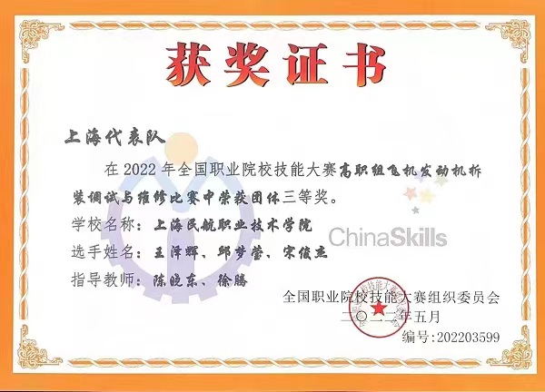 8月26日至29日,2022年“中银杯”全国职业院校学生技能大赛“飞机发动机拆装调试与维修赛项”在湖南株洲举行。经过激烈角逐,由民航维修学院学生王泽辉、邱梦莹、宋俊杰三位学生组成的上海市代表队荣获团体三等奖,展现了民航维修学子的风采。
