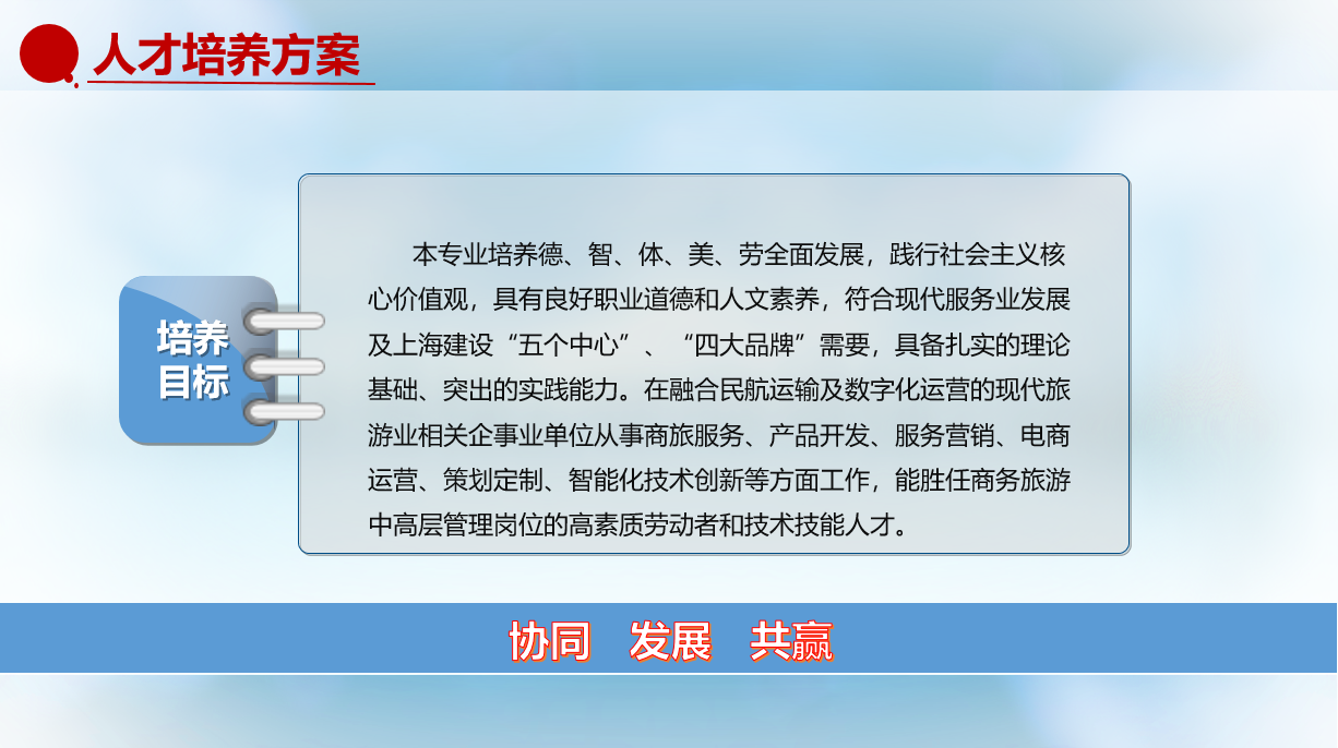根据人才培养方案,该专业将培养在融合民航运输及数字化运营的现代旅游业相关企事业单位从事商旅服务、产品开发、服务营销、电商运营、策划定制、智能化技术创新等方面工作,能胜任商务旅游中高层管理岗位的高素质劳动者和技术技能人才。