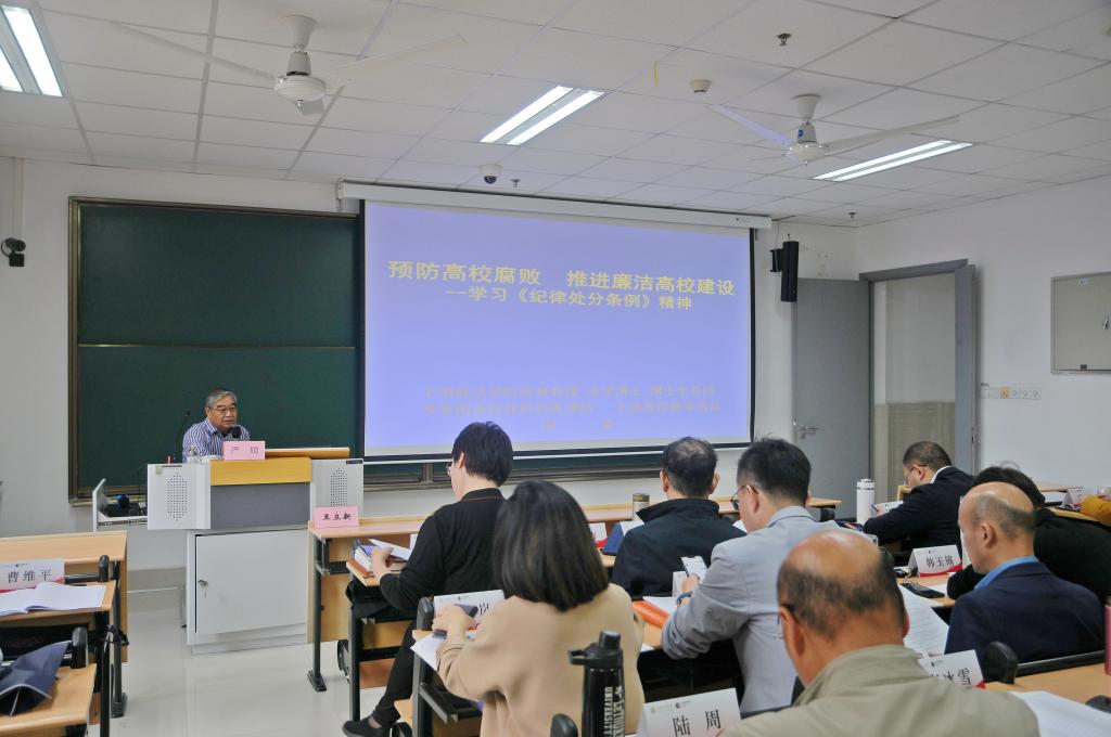 开班式结束后,根据当前正在开展的党纪学习教育,第一次教学课程特邀上海政法学院终身教授、法学博士、博士生导师、享受国务院政府特殊津贴专家、上海高校教学名师严励,为全体学员作《预防高校腐败 推进廉洁高校建设——学习<中国共产党纪律处分条例>精神》专题辅导报告。