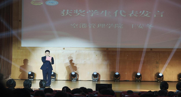 空港管理学院王安冬同学作为优秀学生代表发言,向大家分享了自己的“民航梦”,并鼓励广大民航学子要努力学习专业技能,不断提升自身素养。作为整个社会力量中最积极、最有生气的力量,号召大家要牢牢把握把握历史机遇、担负时代使命,做新时代的奋斗者、五四精神的传承者。