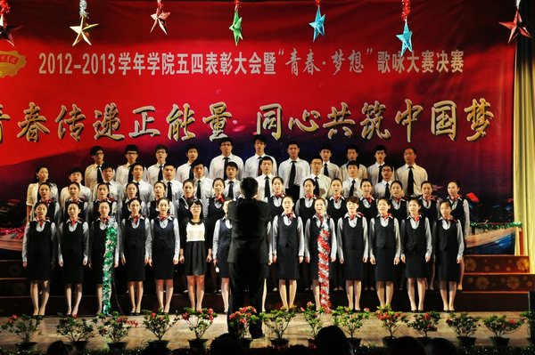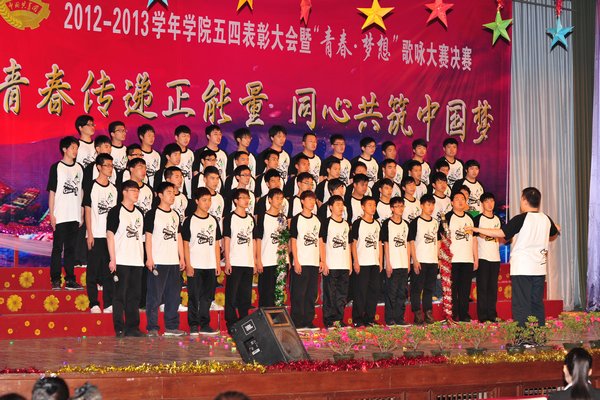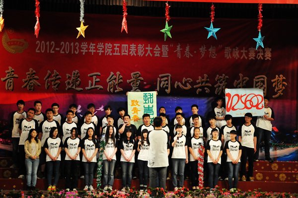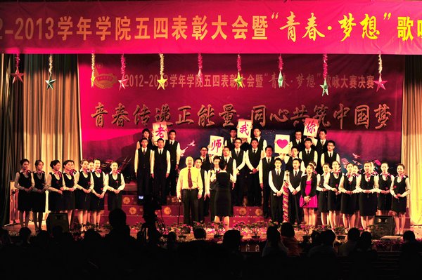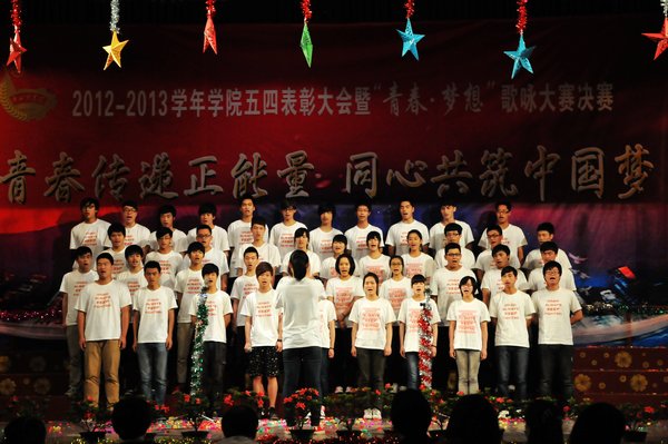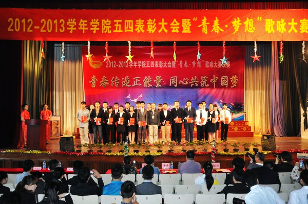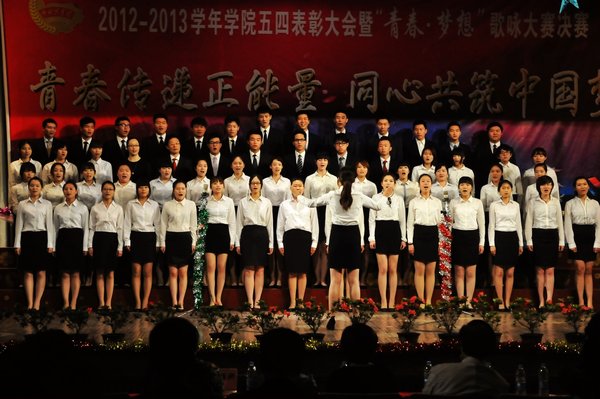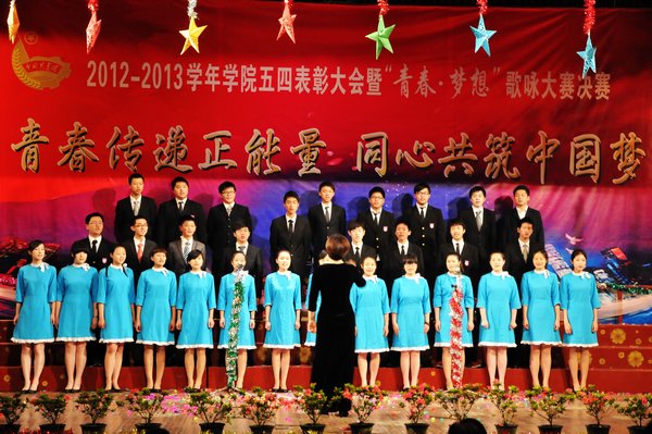 奏响时代的乐章,五四运动走过了九十四个春秋;舞动青春的旋律,共青团迎来了九十一岁生日。为了表彰先进,展现青年学生风采,5月17日下午, 我院2012~2013学年五四表彰大会暨“青春•梦想”歌咏大赛决赛在大礼堂盛大开幕。院党委副书记孙群,副院长孙暄,学生工作处处长潘云,学生工作处副处长哈昀,学生工作党支部书记周维妍莅临本次大会。