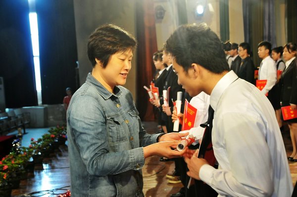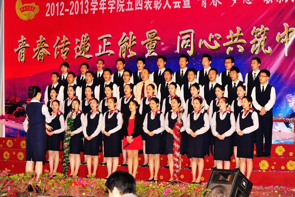 随着激昂高亢的国歌响起,大会隆重开幕。会议首先由院党委副书记孙群宣读《关于表彰2012~2013学年学院先进集体、先进个人的通报》和《关于表彰2012~2013学年共青团先进集体、先进个人的通报》。在这一年中,我院涌现出了一批团结奋进的先进集体和品学兼优的优秀个人,共有9个班级荣获院级先进集体、五四红旗团支部荣誉称号,共有360余名同学荣获院级各类先进个人荣誉称号。在激扬的音乐声中,我院各类先进集体和优秀个人获奖代表依次走上领奖台,收获了属于他们的荣誉和掌声。随后,副院长孙暄为此次表彰大会致辞,他首先向受到表彰的先进集体和优秀个人表示衷心的祝贺。他在回顾“五四”运动九十四周年历史的同时,强调学院举行此次表彰大会,就是要进一步继承优良传统,弘扬五四精神,引领全院广大团员青年求真务实,勤学苦练,为中华民族的伟大复兴,贡献青春、智慧和力量。他希望全院师生站在新的起点上珍惜韶华,胸怀大志,努力把个人的学习成才融入到民航强国的建设中去,把个人的奋斗融入到实现民航强国的奋斗中去,勤奋学习,苦练技能,用优异的成绩、一流的技能成就属于自己的精彩人生。最后,团委电视台播放了精心制作的视频短片《向五四献礼,为青春加油》。视频展现了我院诸多优秀团员青年的青春风采,回顾了一年来团委组织的各类学生活动的精彩点滴,学院领导和辅导员老师也在这个属于青年的节日送上了属于他们的殷切关怀和希望,让在座的各位同学倍加感动的同时也深刻感受到了肩上所担负的责任与使命。青春传递正能量,同心共筑中国梦。在逐梦的路上,我院青年学生一定会勤学至上,勤业之上,以勤学苦练的实际行动汇聚实现民航强国梦的强大力量。表彰大会在隆重的乐曲声中圆满闭幕。