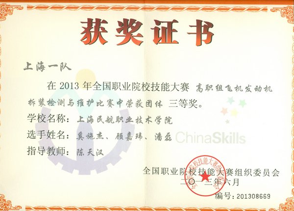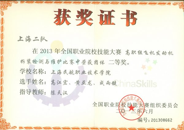6月27、28日,2013年全国职业院校技能大赛高职组飞机发动机拆装检测与维护比赛在天津中德职业技术学院举行,来自全国10个省市的17支队伍的50余名航空专业高职院校技能高手参加比赛。经过激烈比赛,我院高江宏、黄亚龙、成雨键同学组成的上海二队荣获二等奖,奚施杰、顾嘉玮、潘磊同学组成的上海一队荣获三等奖。