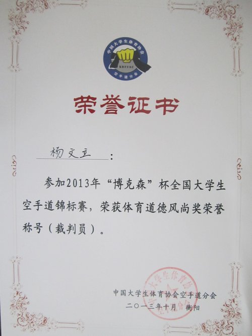 10月18-20日,由中国大学生体育协会主办,北京博克森体育文化发展有限公司、衡阳市体育局承办,衡阳市体育产业中心协办的2013年全国大学生空手道锦标赛在湖南省衡阳市体育馆隆重举行。本次比赛有来自北京体育大学、中国人民公安大学、湖南师范大学、香港大学等近30所高校的300余名大学生运动员参加。我院经管系空保教研室杨文立老师参与了本次比赛的裁判工作,圆满完成了裁判任务,凭借出色的业务表现,获大赛的“体育道德风尚裁判员”荣誉称号。