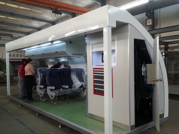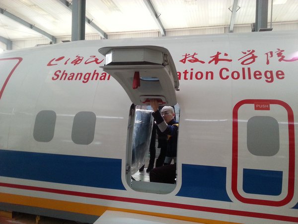 B737-800舱门训练器设备仿真度高,设备配置完全符合局方空乘培训的标准。主登机门为进口航材件、乘务员座椅也是航材件、乘务员控制面板及机上娱乐系统均为功能件;翼上设置功能出口、训练器外部设置有一段模拟机翼,表面安装有挂逃离绳的挂环;操作系统包括视景系统、故障模拟系统、智能测评系统等。该设备的投入使用,对于我校空乘、空保专业学生的实操训练有着很重要的作用和意义。