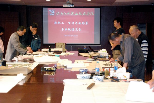 孙莹书记致开幕辞,“百老”讲师团团长戚泉木、名誉团长闫成贵少将、全国劳模、南浦大桥和杨浦大桥总指挥朱志豪同志、全国劳模徐虎同志、以及十余位知名老领导、老将军、书画家莅临现场,纷纷表示祝贺。讲师团的书画家们在观展后还来到学院第一会议室,举行了一场书画现场笔会,大家意气风发、挥毫泼墨,用淋漓尽致的书画作品表达对学院的祝贺和展望之情。