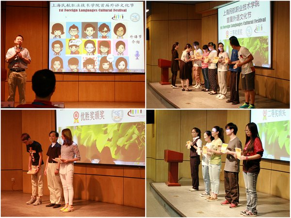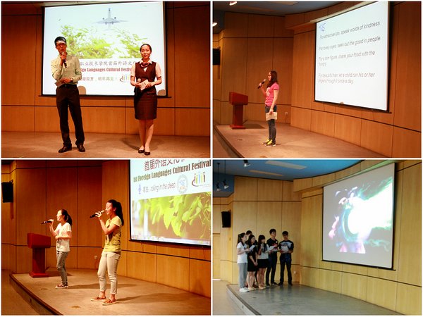 闭幕式由外语教研室姜明老师和学院广播台许颖同学联袂主持。现场除了颁奖环节之外,还进行了两组配音和朗诵比赛,同时还安排了节目外文歌曲的演出。闭幕式,上于再院长和孙暄副院长都在发言中对学院首届外语文化节活动做了肯定,同时还提出了一些建议和想法,希望通过这样的活动为师生提供更好的平台,在锻炼学生外语能力的同时也能有效地增强外语老师的团队核心战斗力,从而将我院的外语教学水平提升到一个新高度。