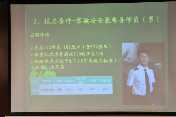 座谈会上首先播放了电影《缘来是游戏》花絮,该片有相当数量画面是在春秋航空拍摄完成的。随后,春秋航空的招聘经理介绍了此次来校招募的岗位:客舱乘务学员、安全兼乘务学员,并结合PPT向大家详细介绍了春秋航空的发展史、在行业内日益明显的竞争优势和招聘岗位的报名条件、面试安排、薪资待遇等细节内容,并特别强调了女生的英语运用能力和男生的体能测试的达标要求。