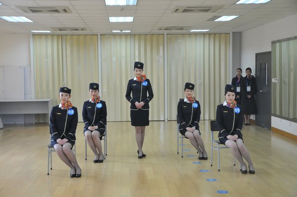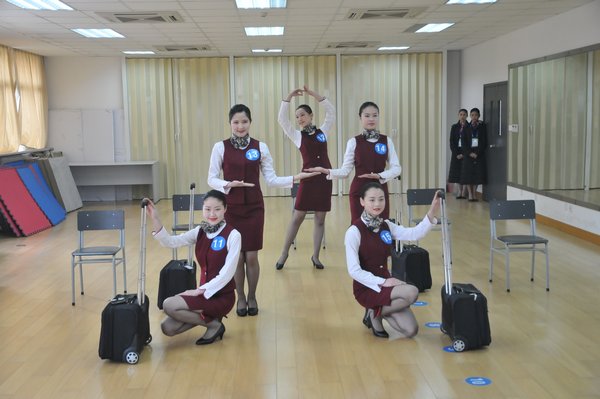 完成空乘职业化妆后,5支参赛队伍参加礼仪展示项目的比赛,这个项目要求每位选手都参与自我介绍和站姿、坐姿、走姿、鞠躬、蹲姿、手势等仪态举止的展示,随后还要即兴回答评委的问题。五组参赛选手在动作编排和音乐的选用上都十分用心、各具特色。有的如梨花初绽,有的如海棠盛开,初次参赛的青涩和多年磨练的大气都给人留下了深刻印象。融入舞蹈动作,加入手语内容,演示机上安全,在选手的自我介绍环节就展现出流畅的英语能力或者将之与礼仪展示紧密结合,5支参赛队各有各的高招;古筝十级、芭蕾八年、礼仪社社长、朗诵比赛大奖,参赛选手们都各有各的精彩。无论是一年级的新生还是三年级的学姐,在即兴回答中都展现了空乘专业学生的气质与风采,“礼仪的美在于真诚,在于自然,在于与人为善”,“乘客虐你千百遍,仍然要待乘客如初恋”,这些即兴回答反映出参赛选手的良好心态。在比赛进行中,选手们的心情可以用“紧张、兴奋和自信”来形容,在排序上,她们做出了“自信、兴奋、紧张”的选择。