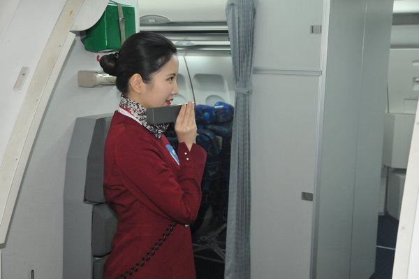 28日下午同步进行了广播词朗读和机上餐饮服务项目的比赛,选手们按参赛编号依次参加比赛。广播词朗读项目在A330-300陆地紧急撤离综合训练舱进行,包括中文广播词朗读、英文广播词朗读和即兴广播三部分内容,评委老师从参赛选手的语言流畅程度、语音标准程度、语速、音量、节奏感和情感等方面做出评分,即兴广播部分还要考量选手现场组织语言的能力,更体现了选手的语言运用能力。