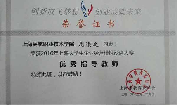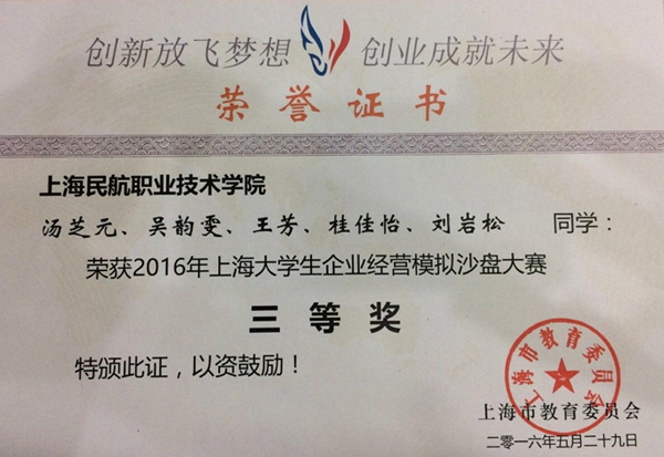 “创新放飞梦想,创业成就未来”。为激发学生的学习热情,开发学生的实践能力,培养创业型和复合型人才,学院经管系选拔优秀学生组建了我校首支大学生企业经营模拟沙盘(简称ERP)代表队,于5月28-29日参加了2016年上海大学生第六届企业经营模拟沙盘比赛,与三十多所高校代表队同台竞技。经过两日的激烈角逐,由我校1554物流专业的汤芝元、桂佳怡、王芳、刘岩松和1456安检专业的吴韵雯、刘诗怡六位同学组成的代表队荣获比赛三等奖,指导教师周凌之荣获“优秀指导教师”称号。