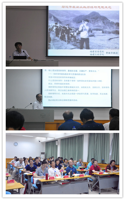 开班式结束后,福建省委党校、福建行政学院教授曹敏华为培训班作了题为《习近平在闽工作历程与思想风范》的专题授课。曹教授按照时间顺序,从“来闽之前的磨练”、“在厦门特区和宁德地区的五年历练”、“主政福州和在省委、省政府工作时的主要业绩”、“习近平在闽工作时的理论思考和思想风范”四个方面,梳理分析了习近平总书记在福建的工作经历、理论思考与十八大后党治国理政新方略的内在联系。11日下午,福建省委党校、福建行政学院教授张诺夫为学员带来了精彩的《学党章党规,明确规范,守住底线》一课。他表示,学习党章党规,就是要引导党员尊崇党章,坚定理想信念,对党绝对忠诚;学习《准则》与《条例》,就是要引导党员牢记党规党纪,守住为人做事的基准和底线。他从“落实全面从严治党的迫切需要”、“党章是党的根本大法”、“全面从严治党的重要制度保证”、“学习教育关键在践行”四方面内容进行了详细讲解。