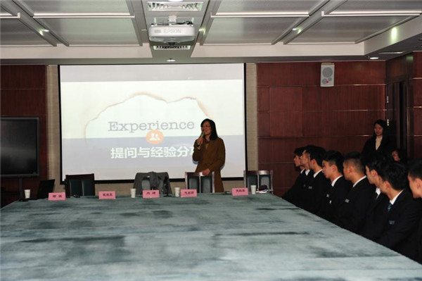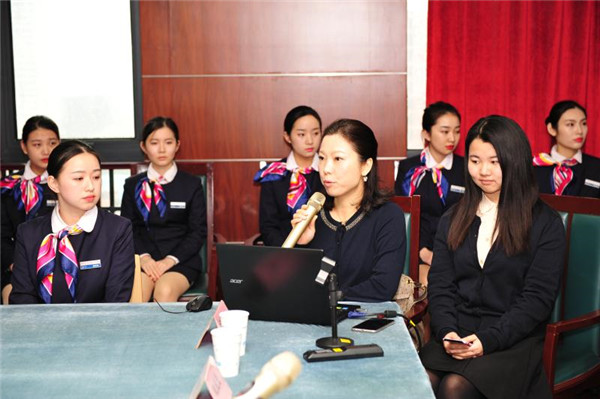 东航培训中心乘务训练部戴继先经理是从我校毕业的优秀校友,她在会上介绍了新雇员初始培训,包括培训的场地、器械、设备、周期、课程,考核的形式、科目等。她从学生角度出发帮助他们分析了现在的形势和即将要面临的考验,同学们获益良多。