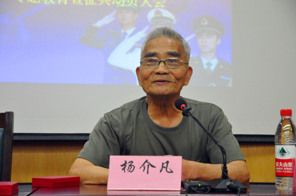 今年已八十岁的老战士杨介凡老师饱含深情地与同学们分享了自己的从军经历。杨老师小时候亲眼目睹了日本对我国的侵略暴行,内心对帝国主义充满了仇恨。大学毕业后毅然投笔从戎,从新兵连到养猪场,再到发挥西北工大飞机发动机专业毕业的优势,在“一穷二白”的基础上,完成了某战斗机设备制造和维护任务,期间两次胃出血,为确保按时完成任务,杨老师一再推迟手术时间。无论在哪里,杨老师都积极发扬吃苦耐劳、自强不息的精神,全心全意为人民服务。在对越自卫反击战期间,杨老师与妻子都自愿报名参战,写下遗书,做好了为祖国牺牲奉献的准备。杨老师的英勇经历深深感动了与会同学,现场数次响起响亮的掌声。他希望同学们积极相应国家的号召,积极报名参军,报效祖国。