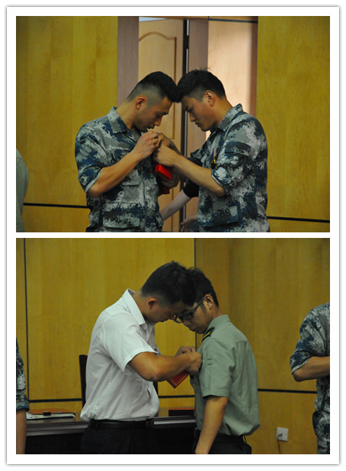 大家庄重地接受勋章,接过这份属于军人的荣誉,小心翼翼地将勋章佩戴在胸前。