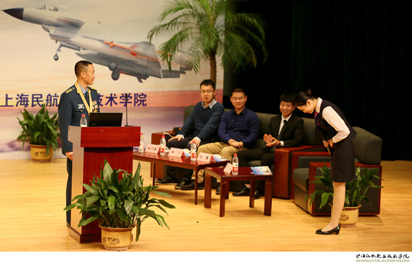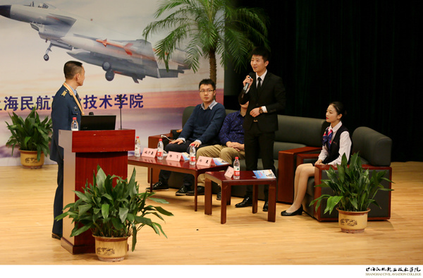 在报告进行中,李中华与台上的南航大青年校友和上海民航学院学生代表进行了面对面的互动交流。来自商飞公司的高远从军迷的角度提问空军挑选外军联合军演对手的原则,来自811所的刘雯询问舰载机着舰困难的解决办法,来自上海轨道交通设计研究院的施宇豪追问英雄当年投笔从戎的缘由,李中华都一一作了精彩的回答。来自87365最快检测中心航空维修系的学生代表郑晨向李中华请教对机务专业学生的建议;来自航空乘务系的学生代表宁一以民航乘务的标准礼仪向试飞英雄致敬、并向英雄请教民航员工的职业素养。李中华从自己飞行23年,其间也飞过民航客机货机的职业生涯出发,表示机务工作要严格遵守工作流程,密切联系飞行,重视工作的法规制度;民航飞行规范,法规意识强,民航训练安排刚性,这保障了民航飞行的安全可靠。李中华最后表示,民航对飞行、运营、空中服务、地面服务各个岗位都有严格规范的训练体系,只要把训练体系做好了,一定会很好;中国民航在安全运营等方面走在世界前列,这就有民航院校的扎实努力,做了大量的工作,他对民航的学生有信心。