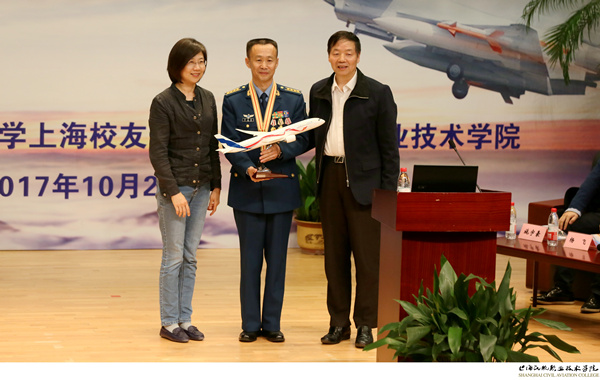 南航大上海校友会名誉会长、中国商飞公司副总经理史坚忠(右一)和南航大上海校友会秘书长邵晓芸(左一)一起向李中华赠送纪念品