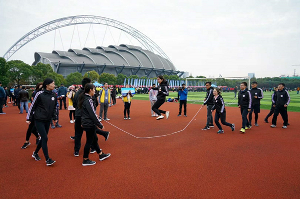 我校辅导员团队抽到的第一个比赛项目是“绳舞飞扬”,在短暂的两分钟,既要保证零失误还要保证跳的个数多。这项运动挑战的不仅是每个人的绳技,更是团队协作的能力。经过部署,团队推选跳的最好的强晓莹老师做“领头羊”,其他老师按照个头、实力、前后配合程度等依次安排,王虎和谢立珂两位个头高的男老师甩绳。经过几轮的试跳磨合,结果都不错,默契又协调。在最后的正式比赛中,团队基本上以零失误的水平结束比赛。
