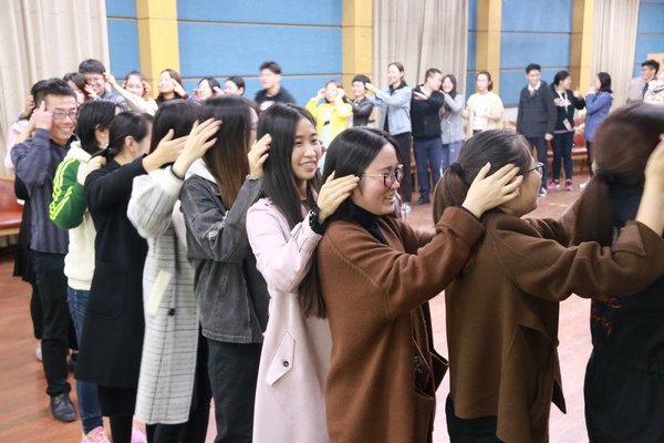 晚上,53名老师齐聚一堂,进行了以室内团队凝聚力为主题的素质拓展。素质拓展伊始,教练让学员们通过热身活动打破相互之间的陌生感,然后通过趣味分组,让小组所有成员蒙眼把手上绳子的绳结打开并摆成最大的正方形。在任务中,学员们认识到了沟通交流的重要性,明白了有时候倾听比急切表达更能快速地解决问题。素质拓展训练过程中学员们从认识到不认识,从不熟悉到形成最大的团队凝聚力,明白了团队的力量才是最大的合力。