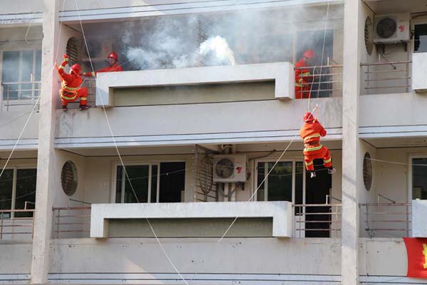 此次消防演习主要有四个内容:应急撤离、灭火器使用灭火、消防水带使用灭火及高空如何利用缓降器逃生。