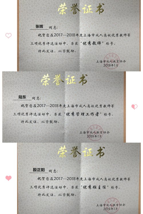 此次会议听取和审议了理事会报告,展示了优秀教学成果并表彰了上海市成人高校2017-2018年度先进。我院航空运输系张辉老师、航空运输系陆东老师、学生工作处殷正阳老师分别被授予2017-2018年度上海市成人高校优秀教师、优秀管理工作者、优秀班主任称号。
