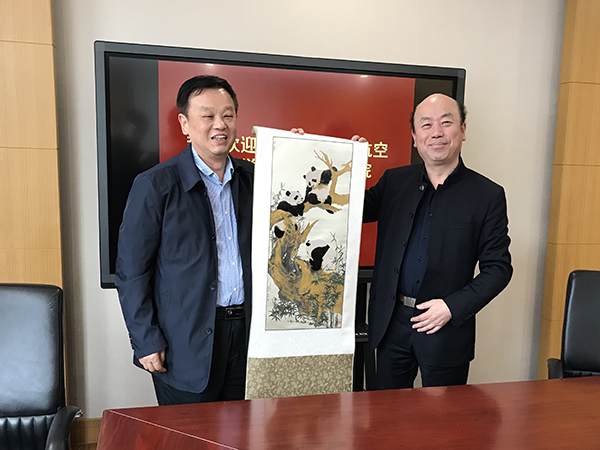 座谈会后,谭院长代表天府新区通用航空职业学院向我院赠送了熊猫刺绣纪念品。随后章院长带领来访团参观了学院的实训场地,双方合影留念。