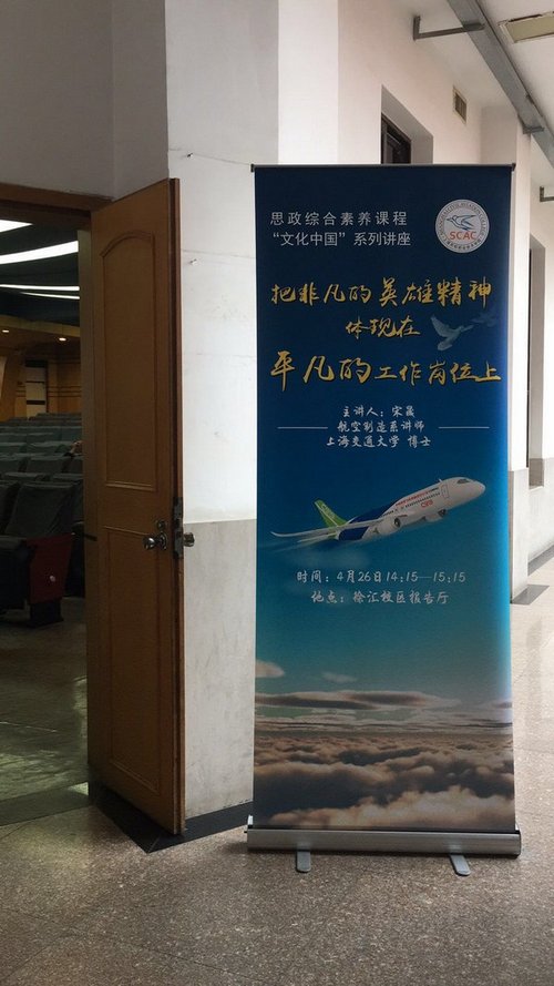 2019年4月26日下午14:15,思政综合素养课《文化中国》第二场讲座在徐汇校区报告厅顺利开讲。本次讲座围绕着中国特色社会主义先进文化中的行业文化展开,以“把非凡的英雄精神体现在平凡的工作岗位上”为主题,由航空制造系、交大博士宋晟老师主讲,基础部思政教研室周文静老师主持,思政教研室林继老师和航空运输系中高职贯通班的学生聆听了讲座。