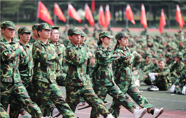 伴随着雄壮的进行曲,各营连会操代表方阵逐一走过主席台,接受检阅。同学们精神抖擞,气宇轩昂,展现了军人的英姿飒爽。