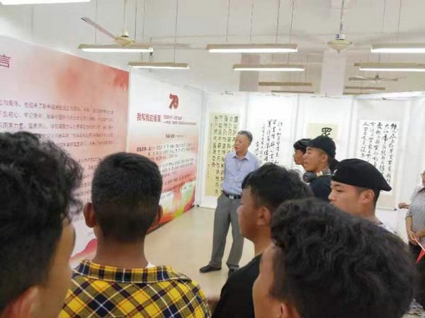 在浦东校区展览期间,航空运输系等系部积极组织学生干部和学生参观书画展。展览最后一天,浦东校区宿管办罗建荣和辅导员陈奕帆带领藏族学生与军训教官三十多人聆听学院关工委老师讲述老将军、老教授书画影和其背后的感人故事。