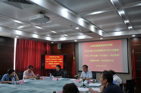开展“不忘初心、牢记使命”主题教育是当前学院政治生活中的一件大事。10月9日上午,学院2019年第11次党委中心组(扩大)学习暨“不忘初心、牢记使命”主题教育第一次交流研讨会在徐汇校区综合楼1205会议室举行。党委副书记、院长胡亚明主持会议,学院领导班子成员章恒龙、杨征、孙暄和在校的中层干部共30人出席会议。民航局党组主题教育巡回指导组对我院的集体学习高度重视,派出副组长余晓阳同志和组员陈冰同志莅临指导。