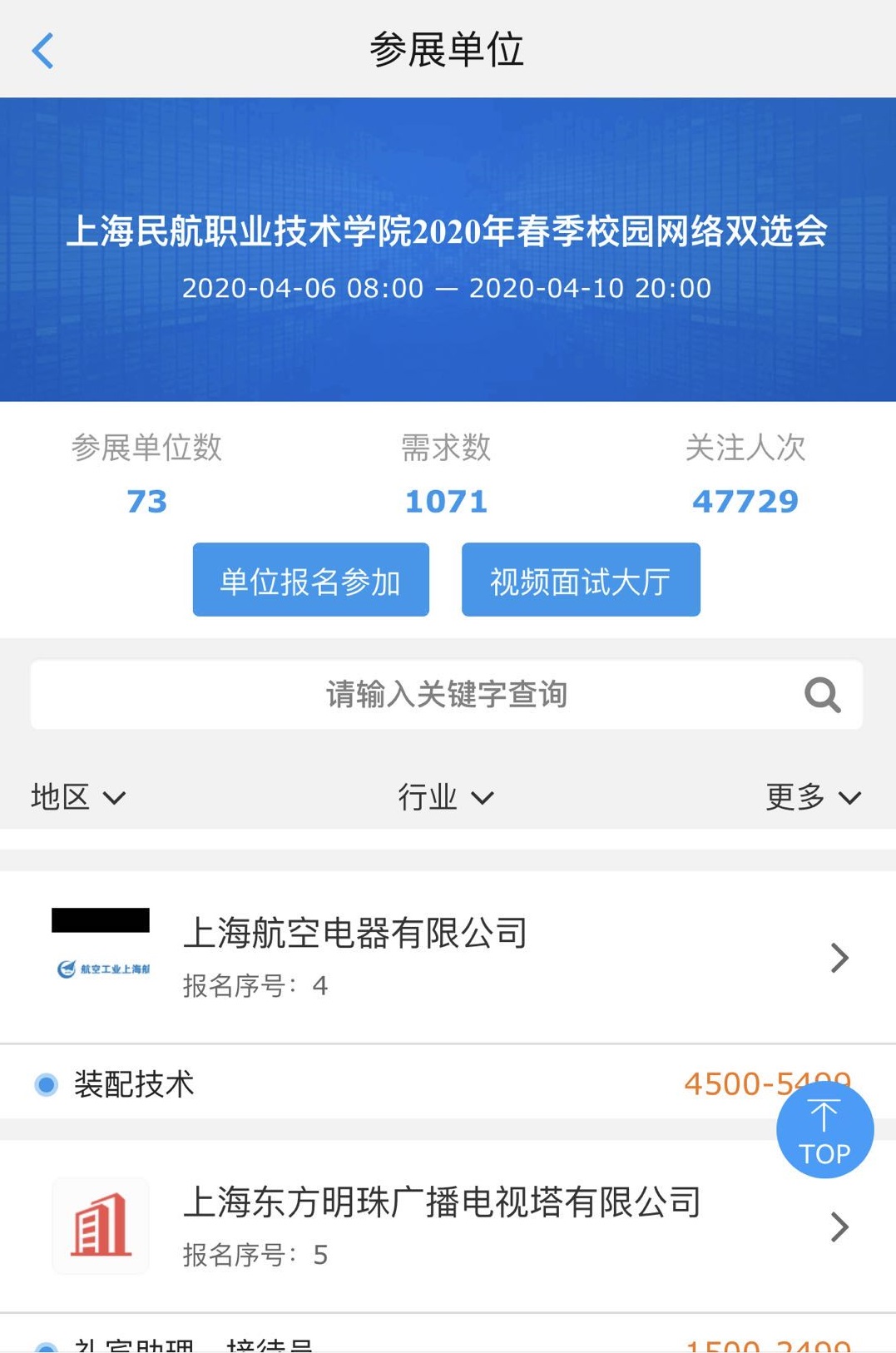 2020年春季校园网络双选会,是学院就业创业新系统上线以后第一次大规模进行线上网络双选会。此次双选会共有73家单位参加,提供155个职位,1071个岗位数量,其中国有企业18家、三资企业12家。73家企业分布12大类行业,主要包括交通运输业、制造业、服务业、零售业等。公司位于上海的有61家,北京市1家、浙江省4家、广东省3家、福建省2家。截至4月8日上午,共有979位学生投递了简历,企业收到简历7000多份。