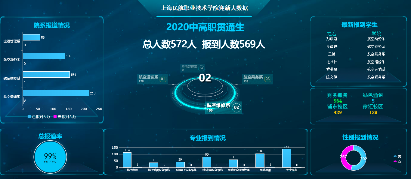 自助“入学报到”系统的功能还不限于此,我们可以实时监测报到数据,了解每个系部的情况,根据现场情况安排志愿者,带领新生先入住宿舍,再进行系部报到,错峰安排。每个志愿者小队负责人的手机都开通了民航助手的扫码功能,学生如果在环节中出现无法自助办理的情况,志愿者就可以用他们的手机人工办理,帮助新生完成新生报到。