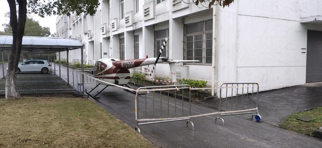 早在项目初期,维修系的老师们通过现场勘查,并对照飞机的尺寸,拟将浦东校区知行楼一楼作为该直升机的实训室。没有想到的是,新购置的直升机是浮筒型,其起落架比常规的R44型要宽不少,仅仅比拟放置直升机的实训室大门超出不到5厘米!装上搬运用的辅助轮基本和门一样宽。直升机又是昂贵的教学器材,搬运的难度可想而知。3月19日,直升机供应商的随机技术人员尝试了一个下午将直升机搬运入室,均没有成功,并断言不拆门不新建坡道绝不可能安全地搬运进去。当天在无奈之下,项目组只得将直升机暂存在知行楼外的通道上,用围栏简易做了隔离。