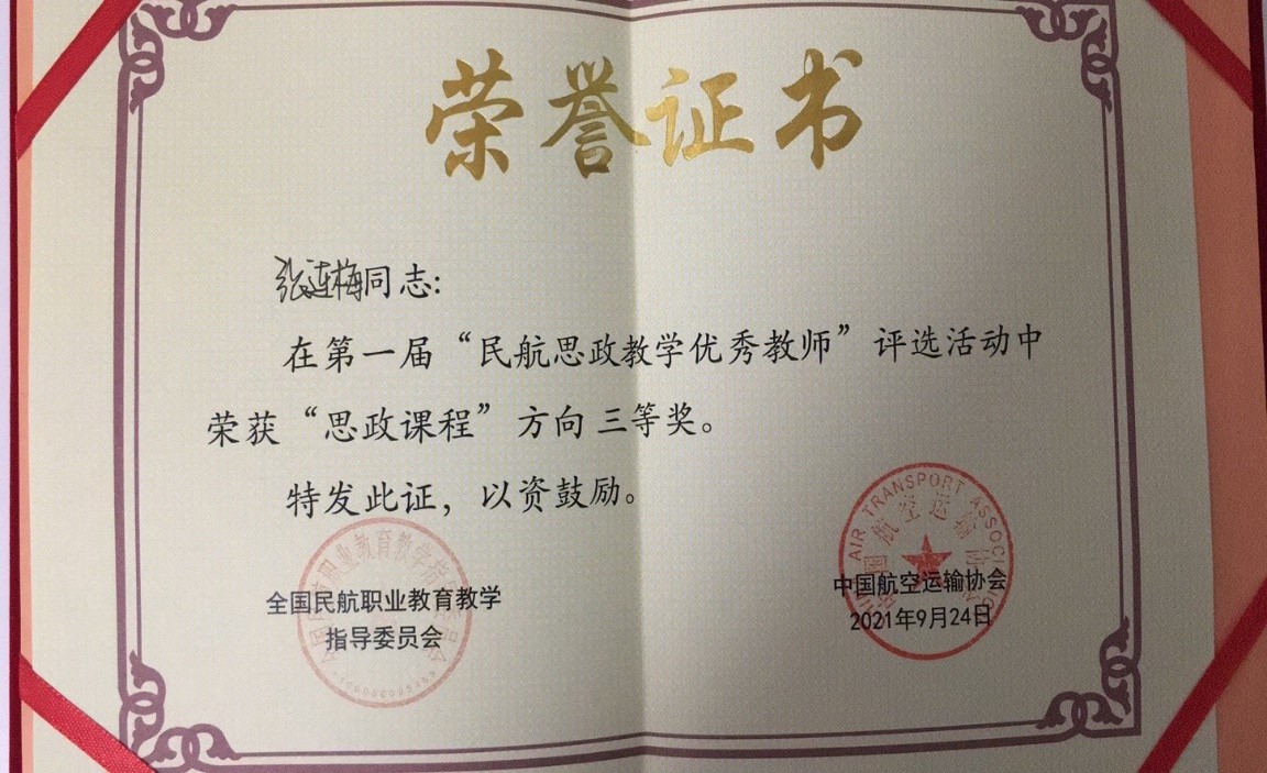 思想政治理论课是高校铸魂育人的主渠道,也是民航行业价值体系建设的重要内容。为深入贯彻落实习近平总书记在学校思政课教师座谈会重要讲话精神,抓好立德树人根本任务,打造高素质的民航思政教学教师队伍,在民航局思想政治工作办公室和全国民航职业教育教学指导委员会的指导下,中国航协举办第一届民航思政教学优秀教师评选活动。9月24日,第一届民航思政教学优秀教师评选活动在北京举行。我院基础部思政教师张连梅参加评选活动并获得三等奖。